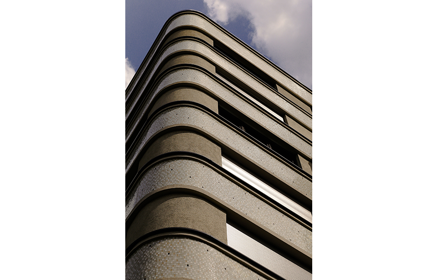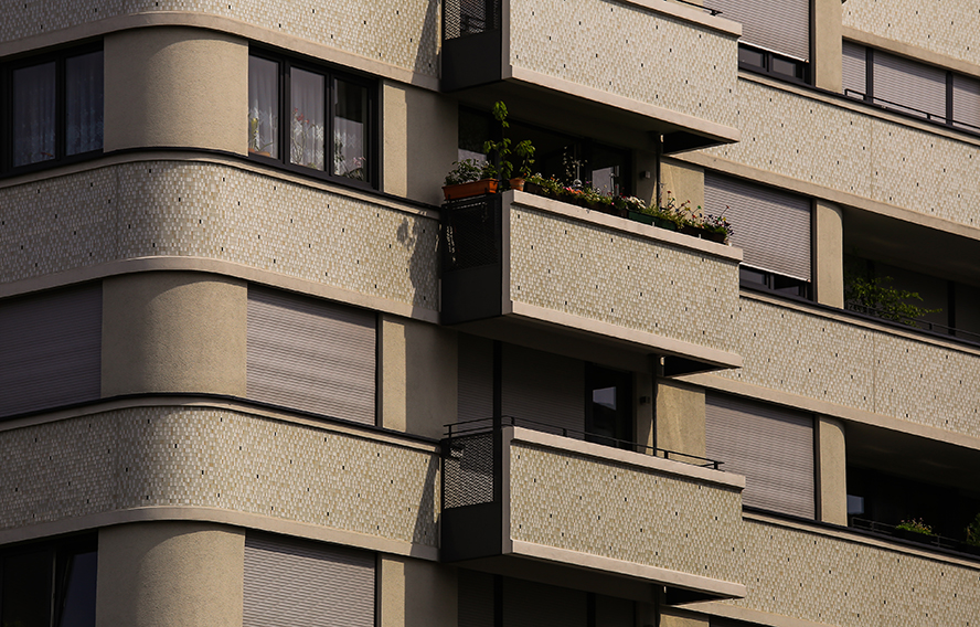 Mit großen Stützenabständen und der Anordnung tragender Wandscheiben konnte die gemischte Nutzung aus individuellem Wohnen, Gewerbeflächen und vollflächiger Tiefgarage realisiert werden.