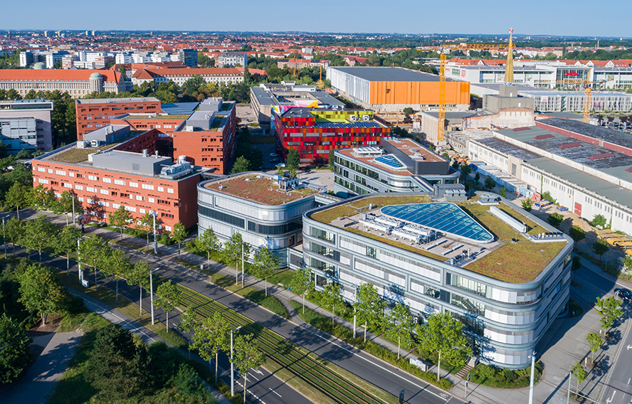 Die drei neuen Gebäude des Fraunhofer-Instituts für Zelltherapie und Immunologie (IZI) sind in ihrer äußeren Form jeweils in unterschiedlichen Größen einer menschlichen Zelle nachempfunden. Sie sind in mehreren Ebenen über Verbindungsstege miteinander verbunden und symbolisieren so die erfolgte Zellteilung.