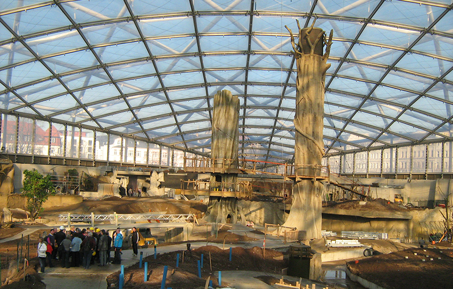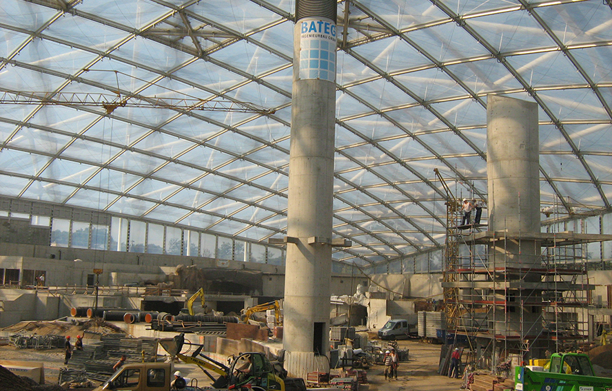 Die Überspannung der Halle wurde mit einer filigranen Membranschale aus Stahlrohren realisiert. An diesem Primärtragwerk ist ein Sekundärtragwerk aus kleinmaschigen Trägern abgehangen, welche die Hülle aus klimaaktiven ETFE-Folienkissen trägt. Diese biegesteife Primärschale lastet umlaufend auf Stahlrohrstützen, welche auf einem massiven Außenring aus Stahlbeton elastisch gelagert sind. Zahlreiche weitere Massivbauten zur Aufnahme von Publikums- und Technikräumen ergänzen die inneren und äußeren Hallenbereiche.
