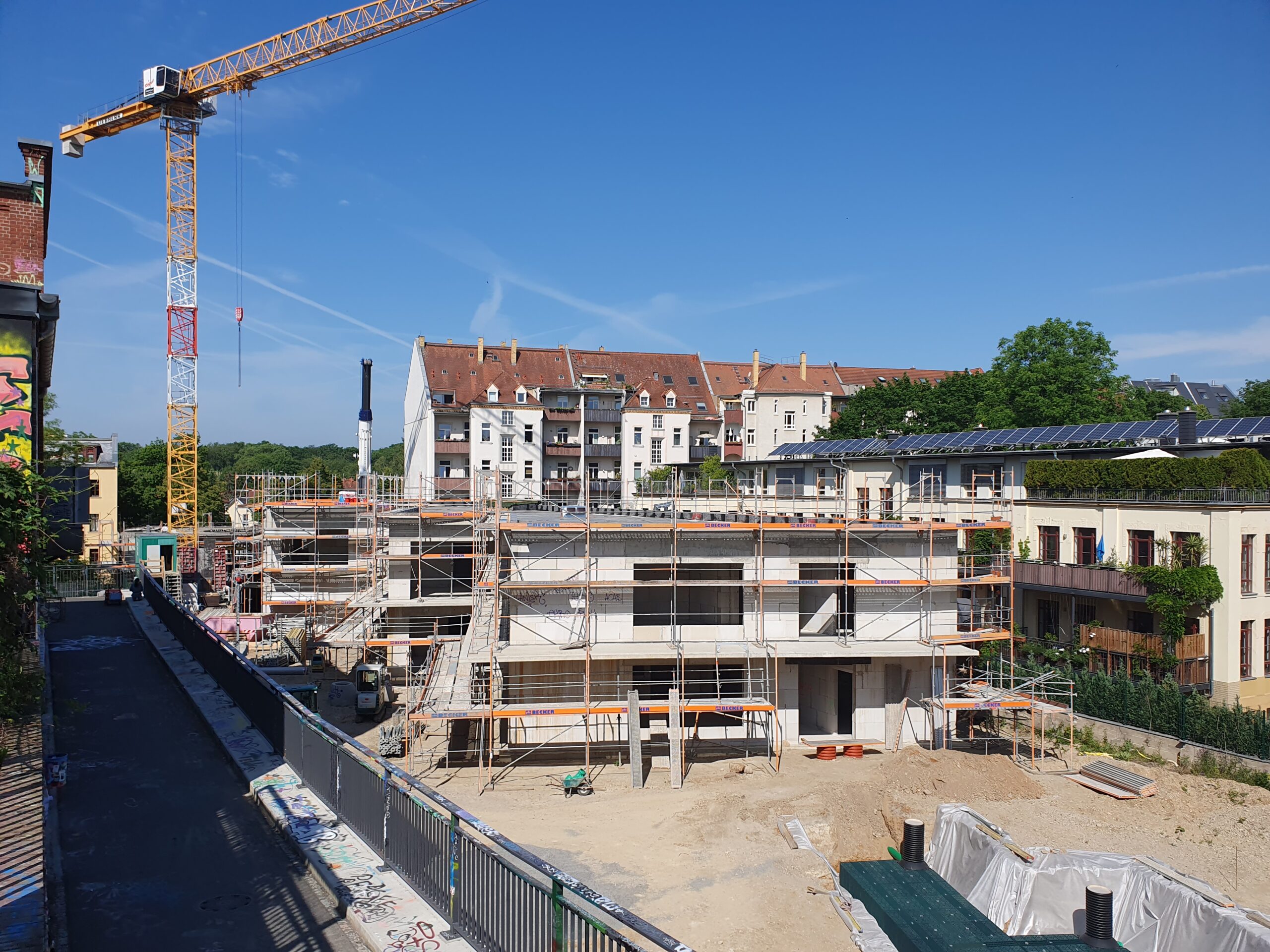 Das SOS Kinderdorf baut auf einer Brachfläche neben dem Werk II in Leipzig Connewitz ein neues Kinderdorfzentrum. Im Vorderhaus an der Windscheidstraße entsteht eine Begegnungs- und Beherbergungsstätte für Kinder, ein Café und Büroflächen. Zwei Spannbetonbinder über der Durchfahrt tragen die aufgehenden 4 Geschosse und ermöglichen so eine breite Durchfahrt für die Feuerwehr, vornehmlich jedoch für den sich öffnenden Zugang in einen geräumigen Innenhof. Hier, im rückwärtigen Bereich des langgestreckten Grundstückes, ist die geplante zweigeschossige Kindertagesstätte bereits im Rohbau fertiggestellt.