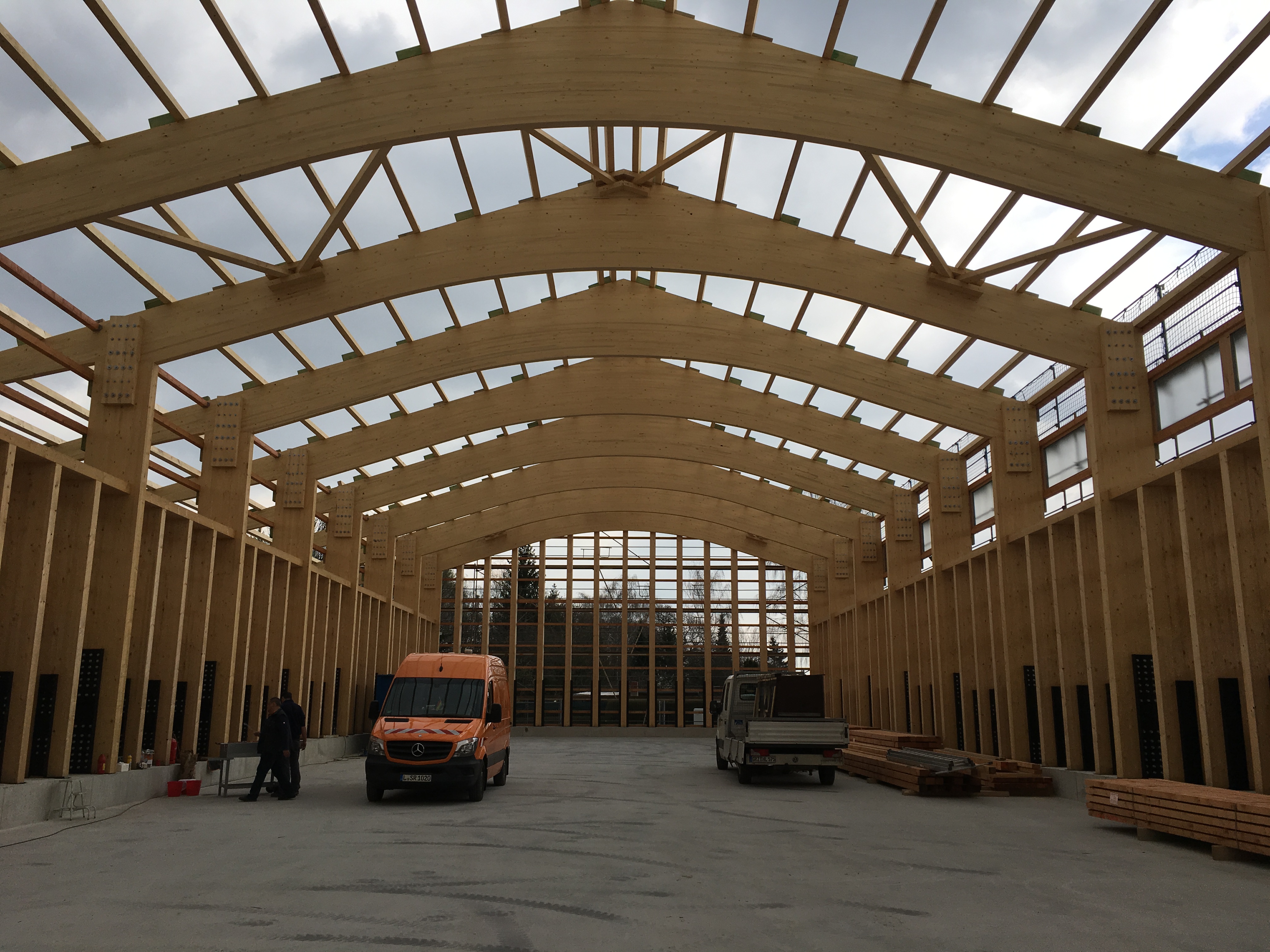 Die Tragkonstruktion besteht aus Zweigelenkrahmen mit Leimholzstützen und -bindern. Die hohen inneren Horizontallasten aus der Salzlagerung werden an den Außenwänden durch eine Einspannung abgetragen. Die Holzstützen sind jeweils an 2 Stahlprofilen angeschlossen, welche biegesteif in den Streifenfundamenten eingespannt sind.