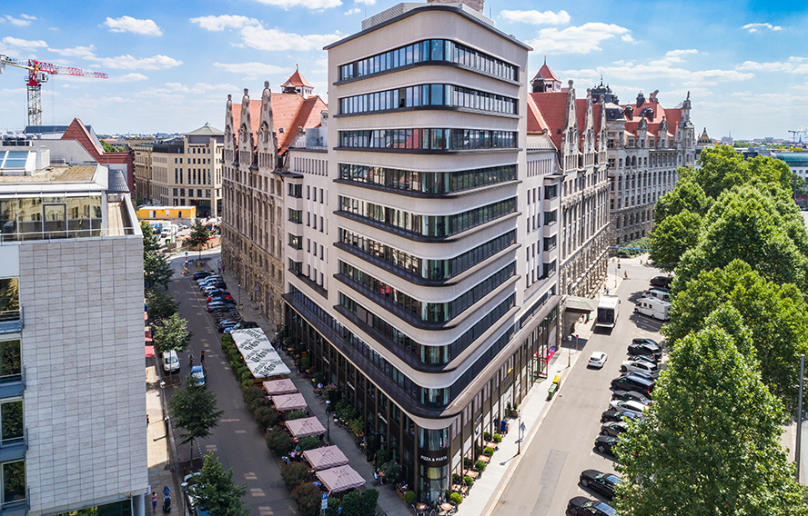 Mit dem 40 m hohen Neubau des Trias-Hochhauses entstand auf dem Gelände der alten Pleißenburg direkt neben dem historischen Gebäudeensemble des Neuen Rathauses eines der modernsten Bürogebäude Leipzigs.
