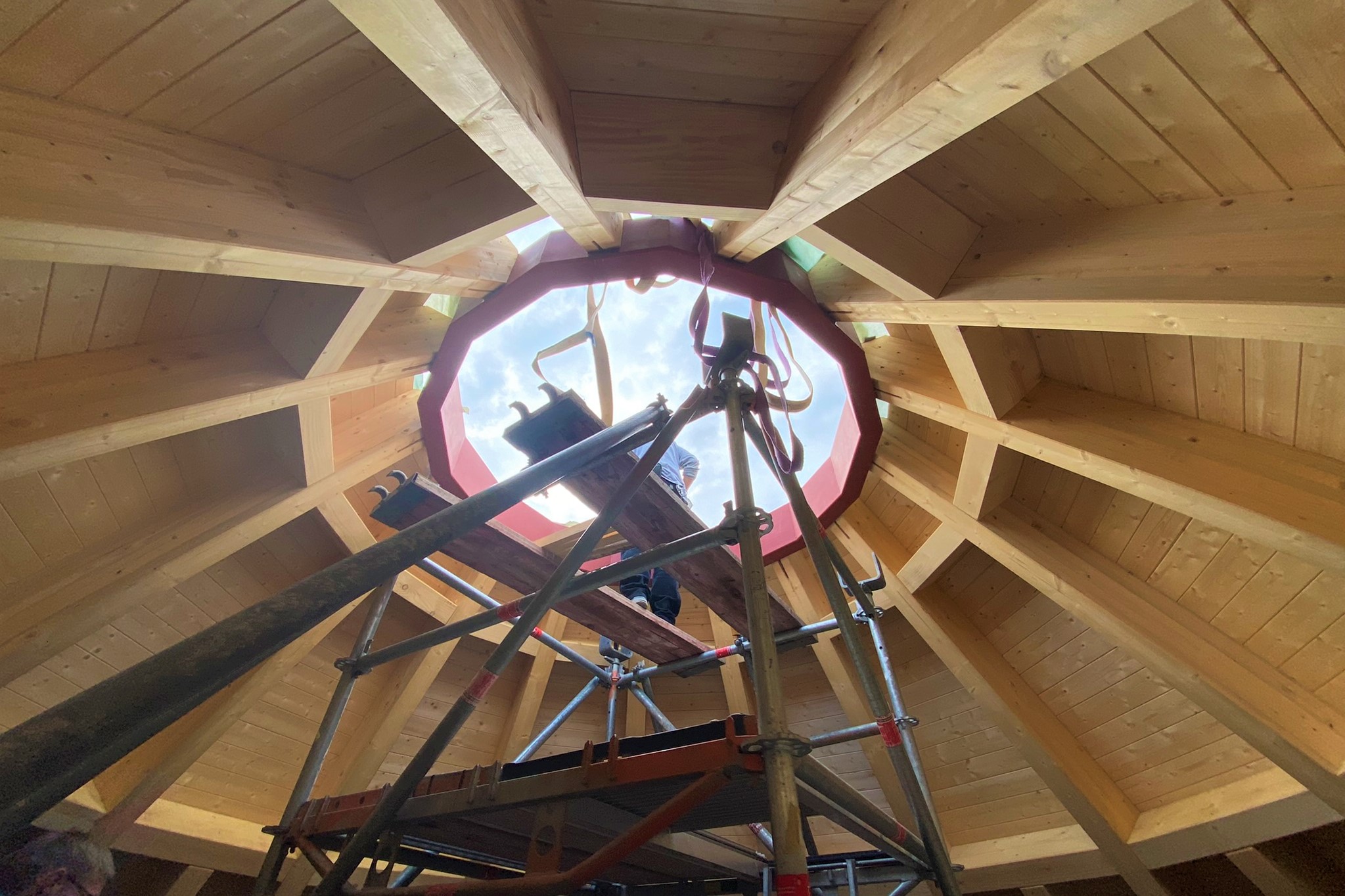 Der vormals hohle Turm erhält über Konsolen eingehangene Stahlbetondecken. Die Wände des Neubaus werden über Streifenfundamente auf dem sehr gut tragfähigen Kies in Sohlhöhe des Bestandsturmes gegründet.